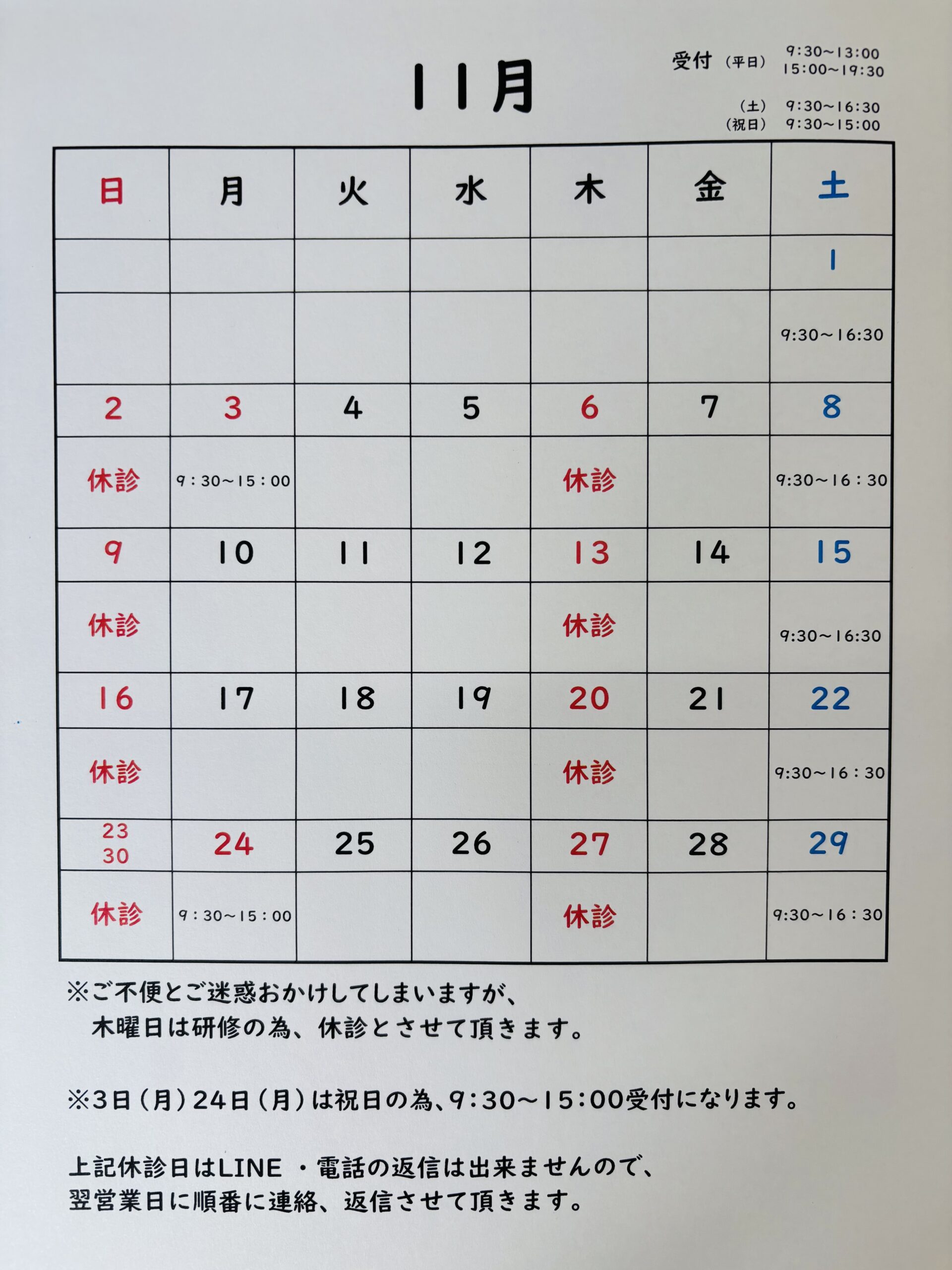 11月 診療時間 お知らせ スケジュール 2025.10.28 上記は11月の日程です。 ご不便とご迷惑をおかけしますが、 7月より木曜日は休診になります。 土曜日、9:30~16:30 祝日は、9:30~15:00までの受付になります。 尚上記休診日と診療時間外は、電話・LINEの返信は出来ないので、翌診療日にご返信させて頂きます。 千葉県習志野市津田沼3-3-15 047-481-8465 京成津田沼北口整骨院